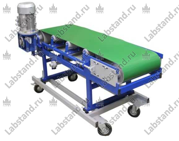 Рама конвейера установлена на четырех вращающихся колесиках, выполнена из стального металлопроката и покрыта защитной порошковой эмалью.
