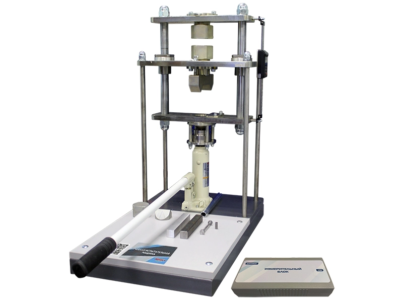 Стенд настольного исполнения представляет собой гидравлический пресс с системой измерения усилия и перемещения подвижной траверсы, обеспечивающей передачу измеренного усилия и перемещения на модуль измерения и далее на ноутбук, где формируется диаграмма деформирования образцов.