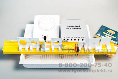 Состав комплекта: батарейный блок питания 1,5 ÷7,5 В (регулируемый) – 1 шт., батарейки (тип АА) – 5 шт., собирающая линза № 1, фокусное расстояние F1=(100±10) мм - 1 шт., собирающая линза № 2, фокусное расстояние F2=(50±5) мм - 1 шт., рассеивающая линза № 3, фокусное расстояние F3=-(75±5) мм - 1 шт., линейка длиной 300 мм с миллиметровыми делениями - 1 шт., экран с держателем - 1 шт., направляющая (оптическая скамья пластиковая с бортиками для соосности оптических элементов и фиксатором для края стола) - 1 шт., осветитель-светодиод белого света с двумя проводами (красным и черным) - 1 шт., фиксатор провода к оптической скамье - 1 шт., слайд "Модель предмета" (буква F) - 1 шт., щель - 1 шт., полуцилиндр, диаметр (50±5) мм, показатель преломления примерно 1,5 - 1 шт., планшет с круговым транспортиром и с обозначением места для полуцилиндра - 1 шт., лоток пластиковый размером 340*270*55 мм - 1 шт., учебное пособие «Лабораторные наборы по курсу физики» (автор Е.Ю. Косарева – 68 страниц – печать офсетная, обложка полноцветная) – 1 шт., руководство по эксплуатации - 1 шт.